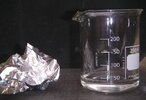 В стакан,в котором находилось 40мл 10% раствора щёлочи, добавили 1,5 г алюминиевой фольги в нескольких долях. В начале реакция протекает медленно, поэтому небольшое нагревание может её ускорить.Вскоре скорость реакции увеличивается и алюминиевая фольга бурно реагирует с щелочью: